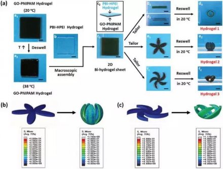 研究人員通過宏觀超分子組裝將收縮狀態的熱響應氧化石墨烯-聚(N-異丙基丙烯酰胺)(GO-PNIPAM)水凝膠層與pH敏感的苝二酰亞胺官能化超支化聚乙烯亞胺(PBI-HPEI)水凝膠層組合,從而得到雙層水凝膠;而通過這種雙層水凝膠,研究人員最終得到了三維水凝膠驅動器。該研究首次實現了智能水凝膠材料的復雜驅動和變色雙功能的協同,在軟體微型機器人、智能開關等智能仿生領域擁有巨大的潛在應用價值,研究人員的這項工作將極大地促進新型仿生智能材料的設計和制造。