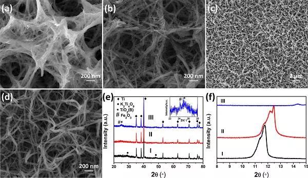 e,f) K2Ti4O9/Ti (I)、FexTi4O9/Ti (II)和Fe-TiOx LNWs/Ti (III)的廣角/小角XRD圖譜。