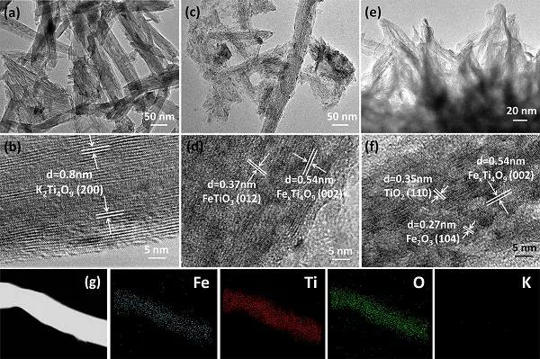 e,f) Fe-TiOx LNWs的(HR)TEM圖像;