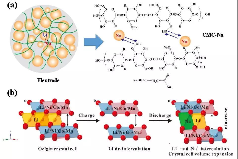 2016年末北京大學深圳研究生院潘峰課題組[1]采用羧甲基纖維素鈉(CMC)作為富鋰錳基材料的粘合劑,通過與PVDF、PAN進行對比,發現CMC可明顯抑制富鋰錳基材料電壓降的發生,并且在在500次循環以后材料仍然保持183 mAh g-1(200 mA g-1),此文章在最后還提出了自己的觀點:CMC里面的鈉離子做電極材料循環的過程中摻雜到鋰層當中,C軸(層間距)增加抑制了電壓降的發生。(如圖1所示)