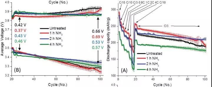 除去在粘合劑方面改善材料性能外,采用特殊氣體對富鋰錳基材料進行處理也是一種簡單易行的方法。以色列的Bar-IIan University和Tel-Aviv University以及美國的Stony Brook University[2]進行合作采用NH3在400℃對電極材料進行處理,發現經過NH3處理1-2h的材料,電化學性能得到了明顯的改善,并且發現在材料的表面發生了一系列的氣-固反應 :Co和Mn的含量減小;結構重排,降低了Co-O, Mn-O鍵的配位數,并且在材料的表面形成了類尖晶石結構;Li+從材料的本體中脫出,在材料的表面形成了LiOH, Li2CO3, and Li2O.這些結構以及表面的改變深刻的影響了材料的性能。(圖2)