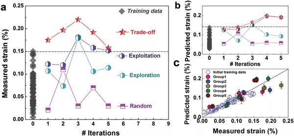 機器學習技術被認為可以從大量材料科學的數據中通過算法搜索隱藏于其中的重要信息,建立材料性能的預測模型,進而實現材料性能的快速優化。機器學習模型雖然可以對未知材料性能做出預測,但是面對大量已有預測值的可能材料,如何最有效地選擇下一步實驗要合成和測試的樣品?近日國際期刊Advanced Materials以“Accelerated Discovery of Large Electrostrains in BaTiO3-Based Piezoelectrics Using Active Learning”為題發表了西安交通大學最新研究成果,該工作發現平衡考慮預測值與不確定性的實驗設計策略在材料開發中更加高效。該工作由西安交通大學金屬材料強度國家重點實驗室孫軍教授、丁向東教授團隊博士生袁睿豪、薛德禎副教授等與美國洛斯阿拉莫斯國家實驗室的Turab Lookman教授合作完成。