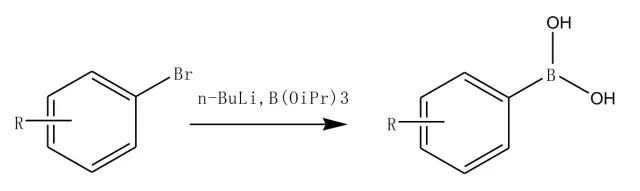 該反應過程分為兩步:首先加入丁基鋰試劑生成中間體,然后中間體與加入的硼酸三異丙酯反應。
