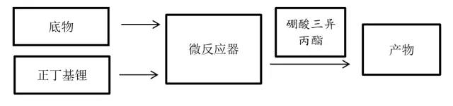 反應主要由進料系統和反應系統兩部分組成。底物和正丁基鋰通過柱塞泵打入微反應器中,在微反應器前半段中反應完成后與加入的硼酸三異丙酯在微反應器后半段反應,得到產物。