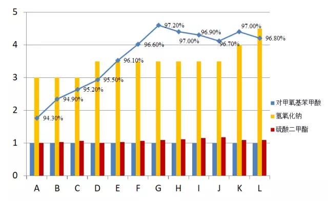 圖6 不同物料配比對合成對甲氧基苯甲酸的影響