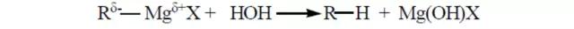 格氏試劑——烷基鹵化鎂,是含有C-Mg鍵的金屬有機化合物,它的C-Mg是高度極性的共價鍵(Rδ-:Mgδ+:X),富電子的碳(潛在的R-離子)具有很強的堿性和親核性。故格氏試劑是一種很強的堿,也是一個很強的親核試劑,化學性質(zhì)極為活潑,可與雙鍵、羰基等不飽和鍵發(fā)生親核加成。
