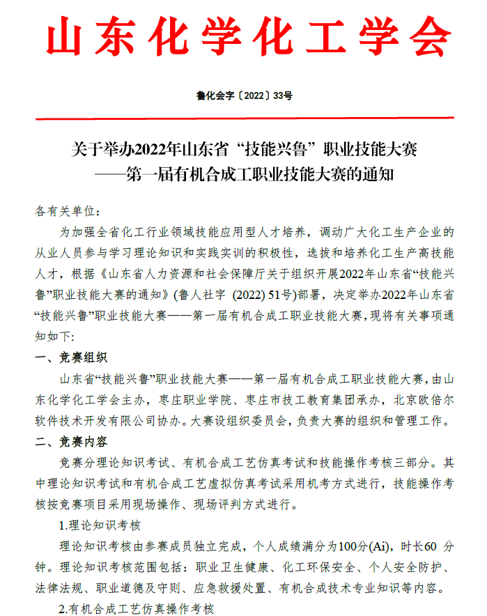 關于舉辦2022年山東省“技能興魯”職業(yè)技能大賽——第一屆有機合成工職業(yè)技能大賽的通知