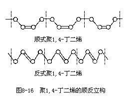 。前者存在有規立構(即立體規整性),而后者由于主鏈中有C=C雙鍵,存在順反立構(也叫幾何立構),見圖8-16。