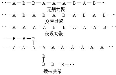 由一種單體聚合而成的聚合物叫均聚物,如聚乙烯。由兩種或兩種以上的單體聚合而成的聚合物叫共聚物,如丁苯橡膠和丁腈橡膠等。在共聚物中,按照單體的分布情況可分:無規共聚、交替共聚、嵌段共聚和接枝共聚等:
