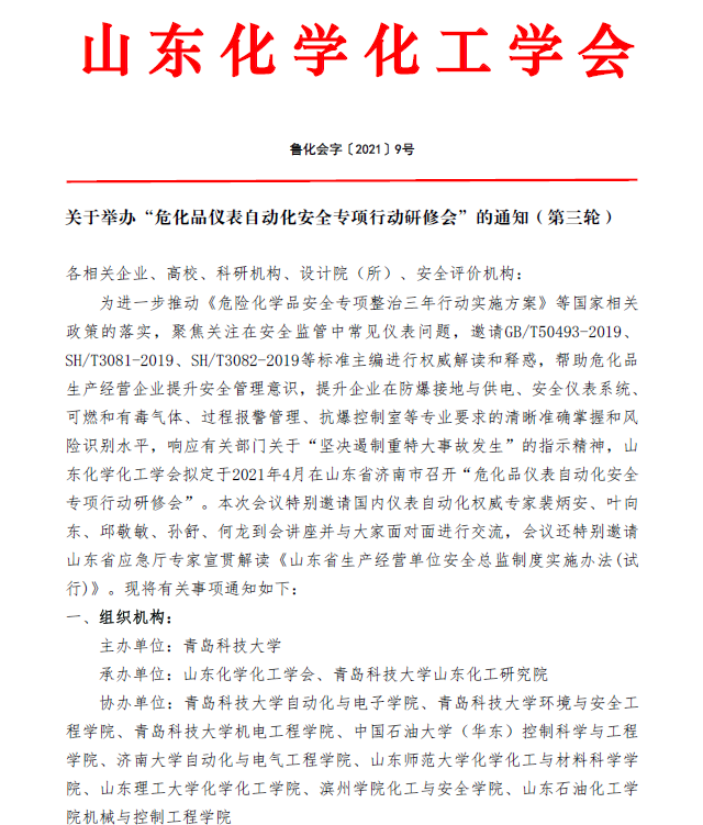 關于舉辦“危化品儀表自動化安全專項行動研修會”的通知(第三輪)