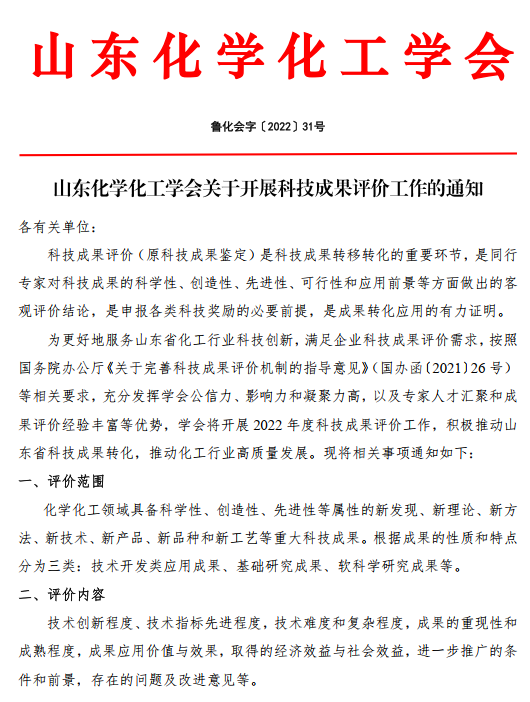山東化學(xué)化工學(xué)會關(guān)于開展科技成果評價的通知