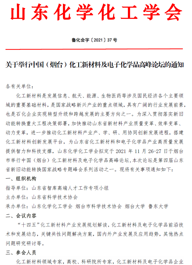 關于舉行中國(煙臺)化工新材料及電子化學品高峰論壇的通知